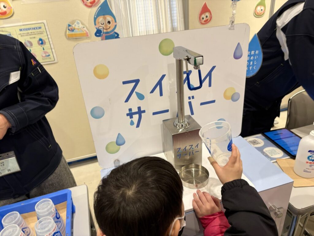 遊んで喉が乾いたら、スイスイサーバーで水道水を飲んで一休み。アンケートに答えた方にはオリジナルカップのプレゼントも。