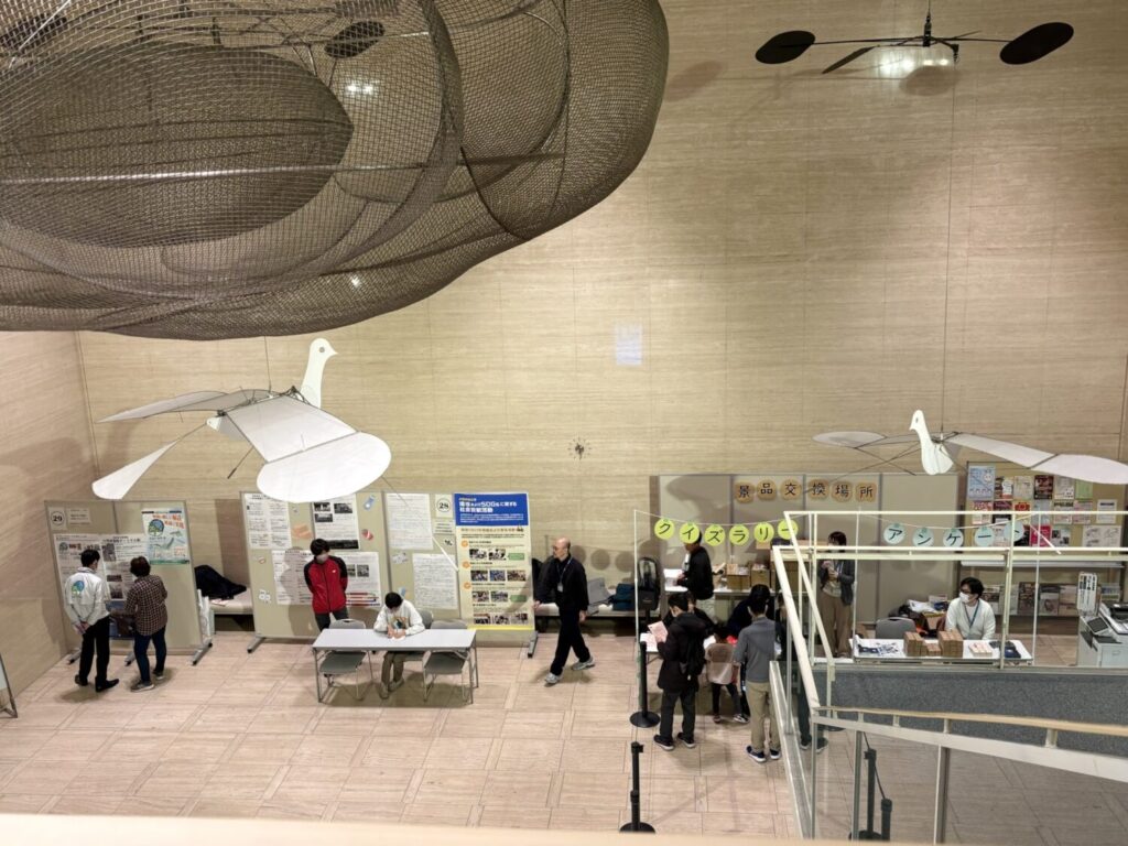 2階の入り口から館内に入ると、風の彫刻家 新宮晋さん作のモニュメントが賑やかに出迎えてくれます。1階がメイン会場となっており、フロアの各部屋やロビーでは多くのブースが出展されていました。