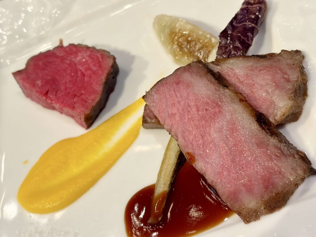 メインを飾るのは、のざき牛の部位ごとの個性を一度に堪能できる贅沢な盛り合わせです 。マディラワインを使用した甘美なソースが、お肉が放つ芳醇な和牛香をより一層引き立てています。