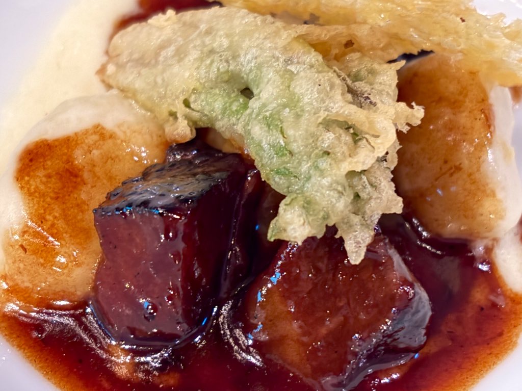 のざき牛の旨味が凝縮されたラグーソースに、ホクホクとした新じゃが芋のニョッキが絶妙に絡み合います。 シャルドネが持つふくよかな果実味はラグーの濃厚なコクを優しく包み込んでくれました。 さらに、山菜のフリットが放つ春の香りが心地よいアクセントとなり、華やかに鼻を抜けていきます。