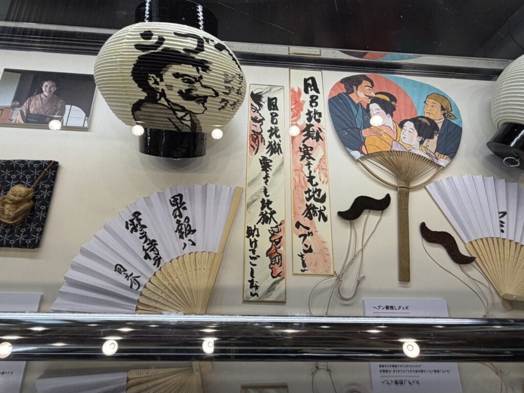 こちらはヘブン家推しグッズ。作中に登場したもので、付け髭やうちわもあります。現代の推し文化と通じるアイテムが並び、推し文化はこの頃から根付いていたのかもしれませんね。