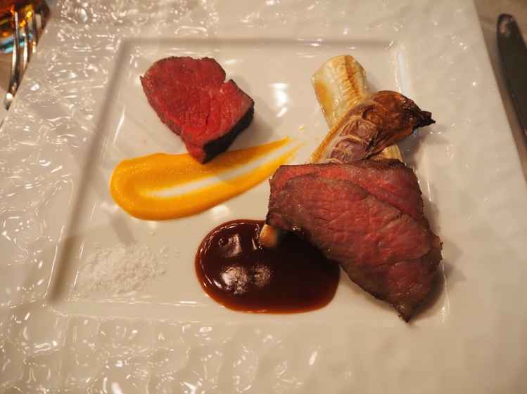 「車海老とカラスミのアーリオオーリオ」と「キッタラ寒サワラのサルタート 灰干し ヴァンブラン そら豆」と続き、メインディッシュ、「鹿児島県産和牛(のざき牛)の盛り合わせ マディラワイン白茄子」の登場です。