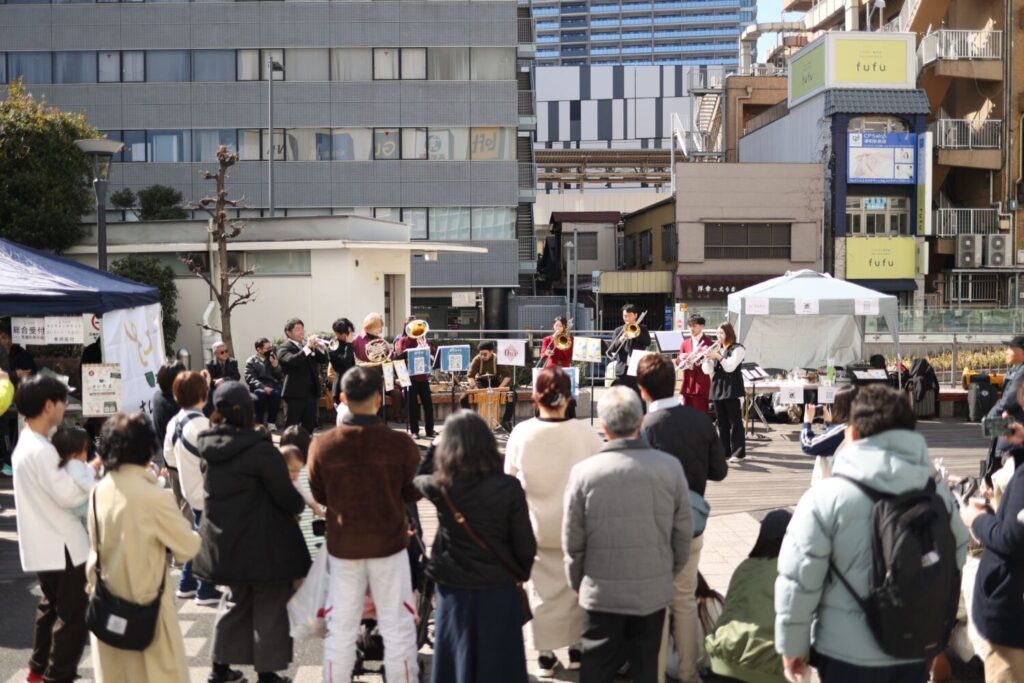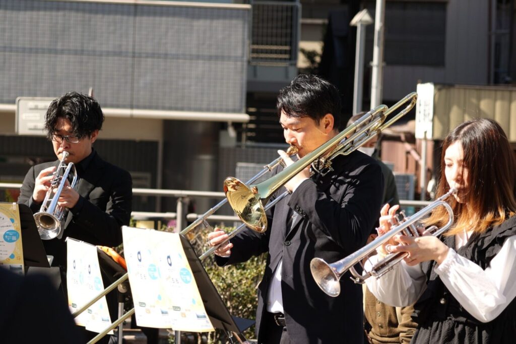 「アンパンマンのマーチ」から「ロッキーのテーマ」まで、どの年代も楽しめる曲が演奏されています。小さなお子さんが演奏する人のそばへいき、リズムをとる様子も実に楽しげ。