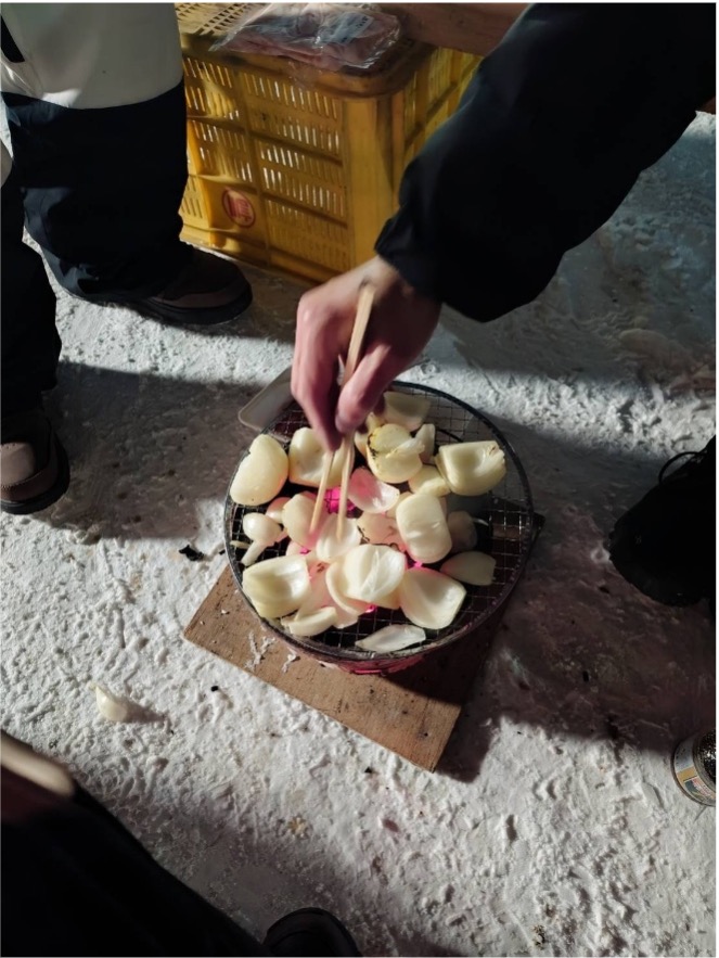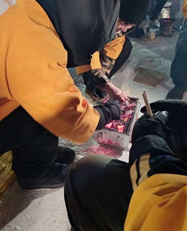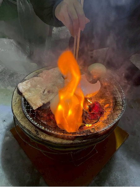 マイナス10度の中で飲む「八重泉」。酒の肴は道産の牛サガリ・豚ホルモン・豚肩ロース・玉ねぎ。