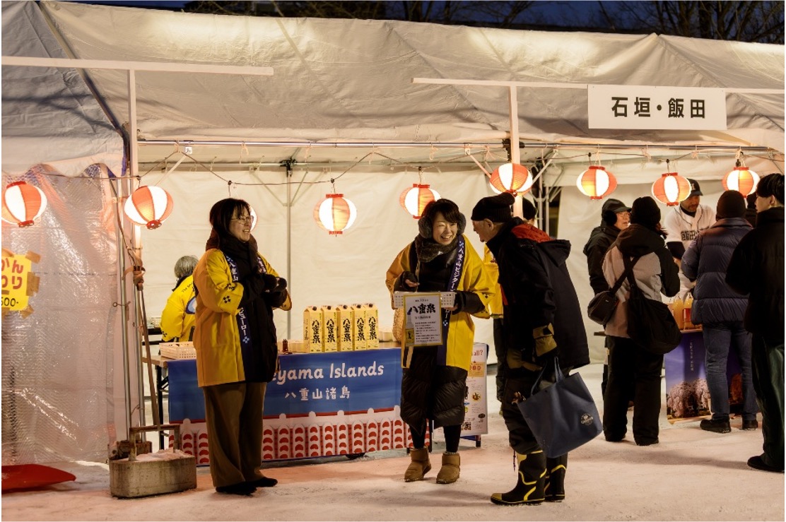 そんな遠い遠い北の大地で、しかも真冬のピークに、八重山諸島が大々的な観光プロモーションを行ないました。皮切りとなったのは2月6日(金)北海道北見市で開催された「北見厳寒の焼肉まつり」。