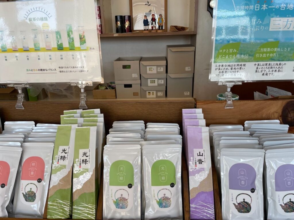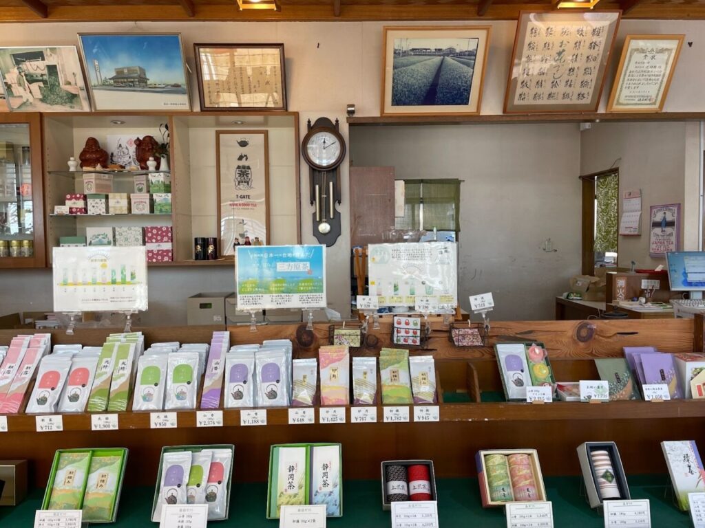 目の前の茶畑を眺めながら、その茶葉からつくられたお茶を選ぶ。茶畑と店舗が近いからこそ、お茶との距離がぐっと近づくような場所です。