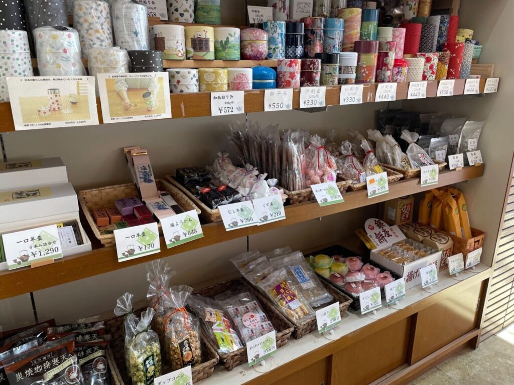 棚には、緑茶をはじめ、ほうじ茶や和紅茶が並び、お茶請けや急須、茶筒、冷茶を楽しめるポットなど、お茶の道具類もそろっています。