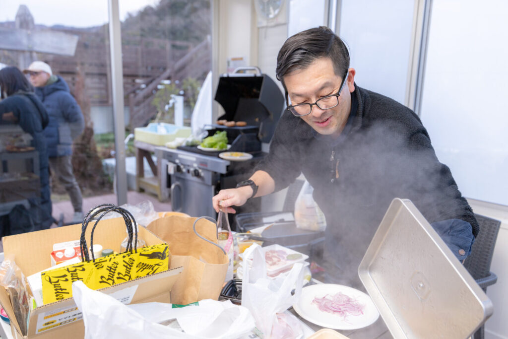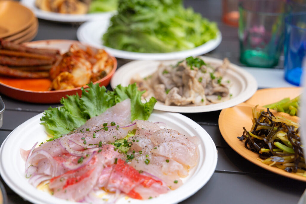 テーブルの上には「どうだい?」運営の宮本さんがシェフのごとく手際よく料理をしてくれた、華やかでおいしそうな皿が並んでいます。