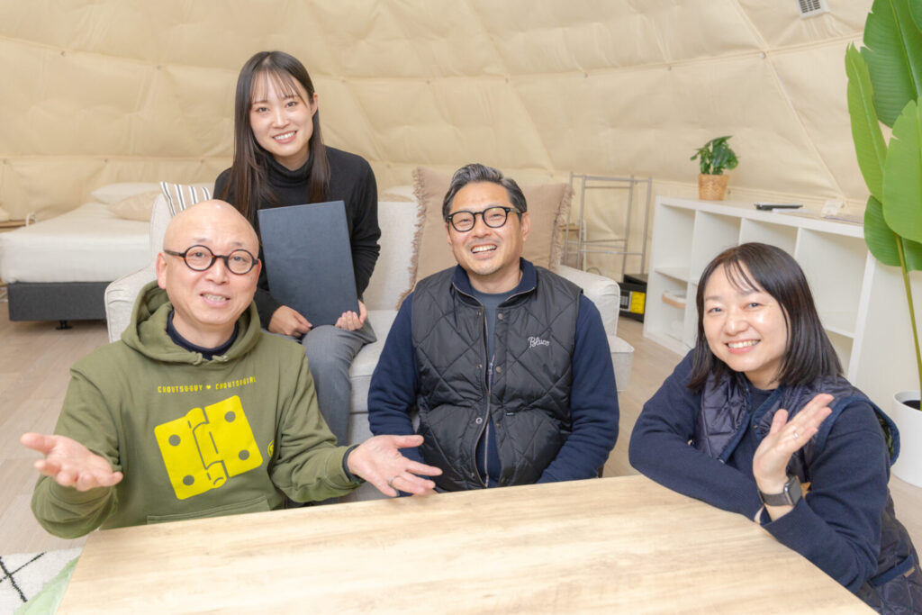 グランピングテントの中でパソコンの画面を見ながら、「この場所だとステージで何か始まると音が出せないよね」「さまざまな業種が集まってのブースなので、配置をどのようにしたら効果的?」「前回出展時はブース内でミニピッチをやって好評だったね」などつぎつぎと意見が出され、運営のアイデアが飛び出します。