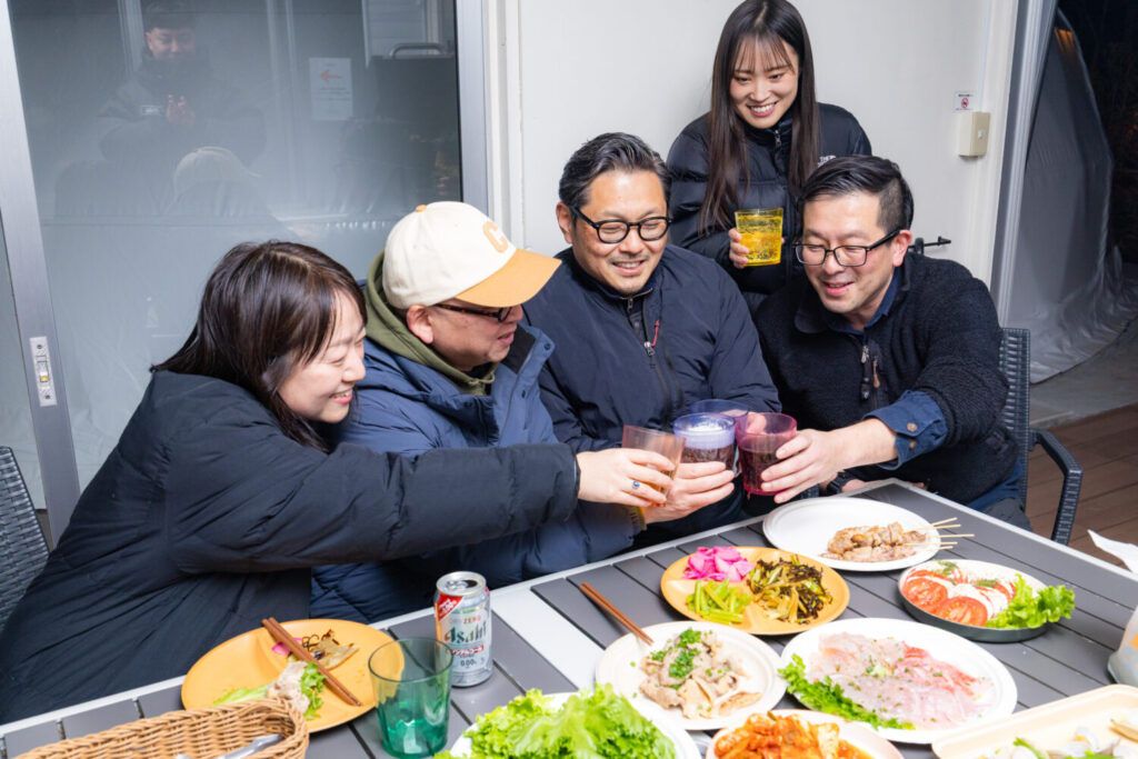 美味しいお食事で笑顔のグランピング懇親会