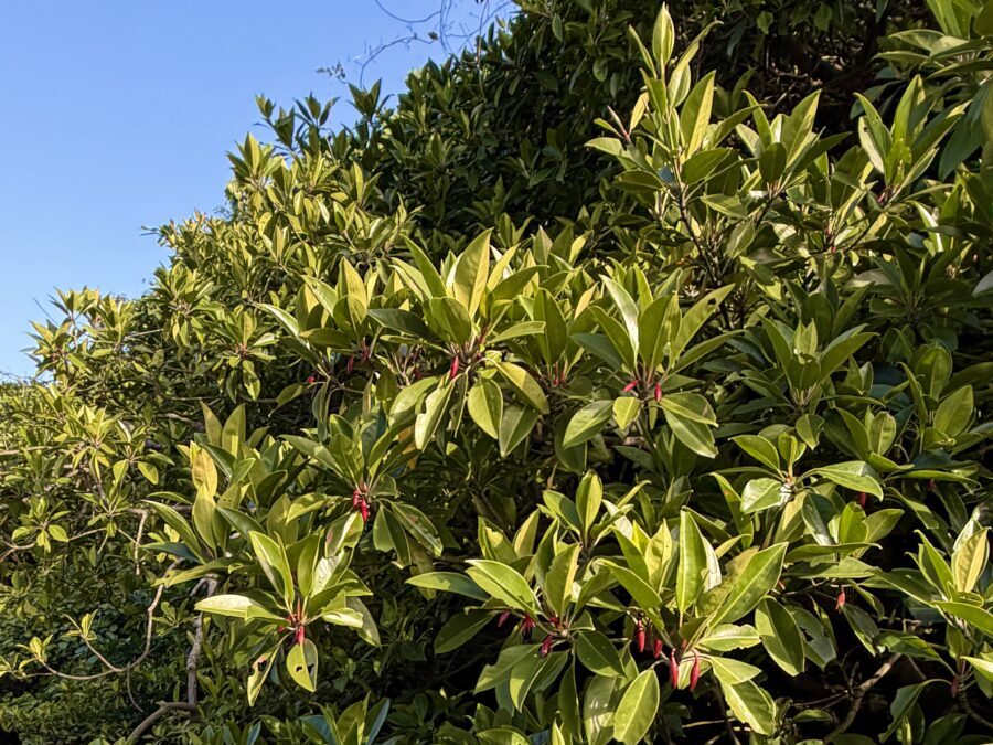 宮良川にはヤエヤマヒルギなど3種のヒルギが自生しており、カヤックでヒルギのすぐ側まで近づいて観察することができます。タコの足のように力強く広がる独特な根っこ。鮮やかな緑と、時折混じる黄色い葉。枝には目を引く「赤い種子」も実っていました。