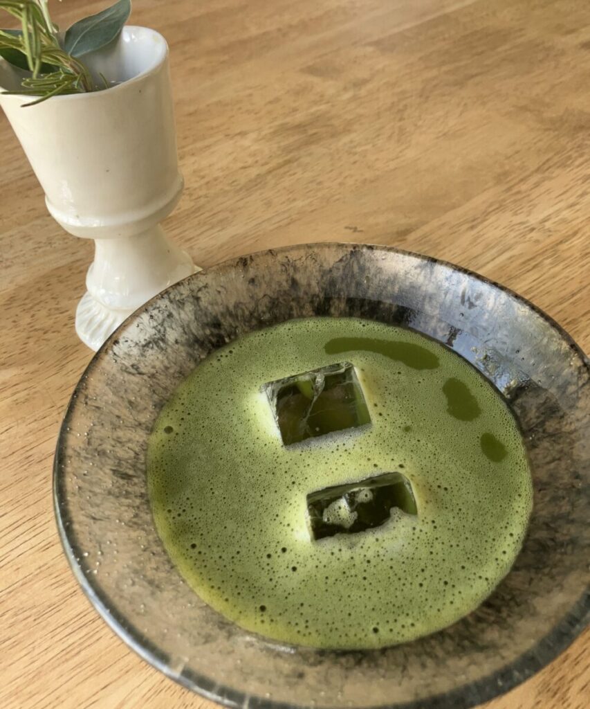 いつみさんが点ててくれたお抹茶。ほろ苦さの奥にまろやかな甘みが広がります。この日は暑い夏の最中だったので、氷を落とす配慮もしてくれました