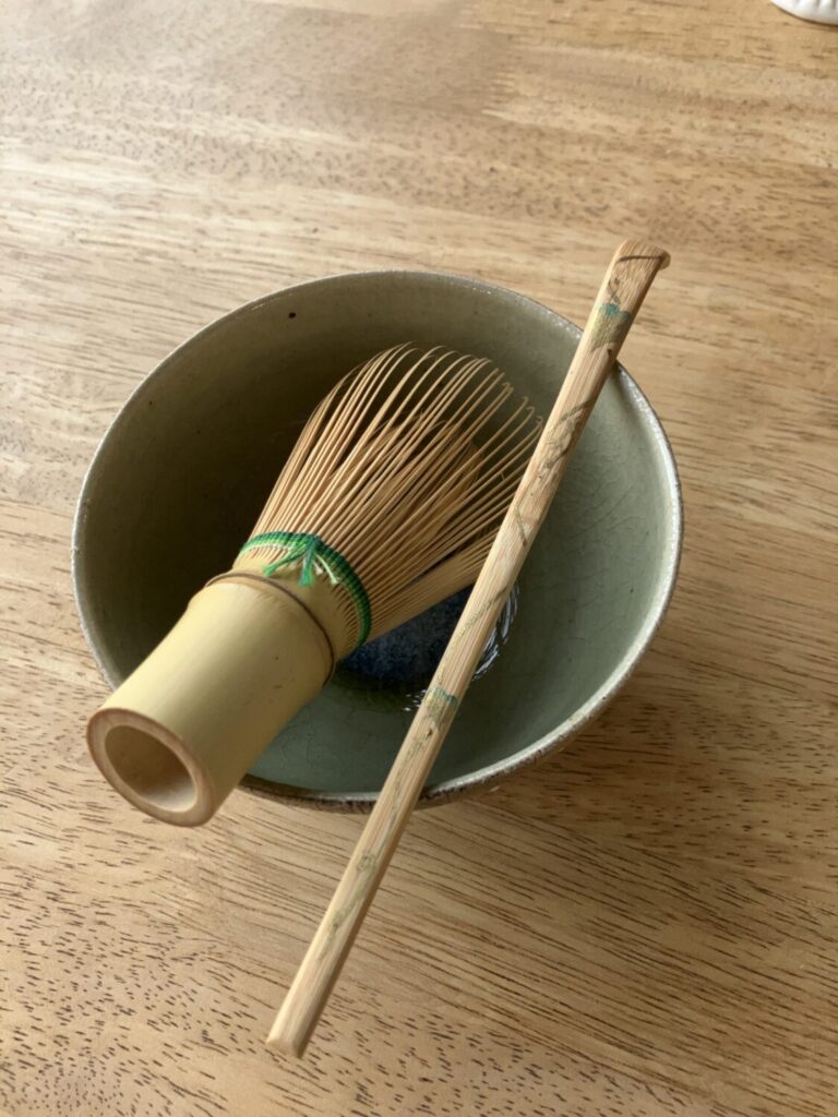 いつみさん愛用の茶道具。豊田市小原地区の蒔絵師さんに教えをいただいて自ら蒔絵を施した茶杓(ちゃしゃく)に、東栄町の陶芸家・山本幸嗣さんの器を見立てて使用。茶筅(ちゃせん)は仲良くしていただいている奈良の高山茶筅師さんに、オリジナルの色糸を使ったものを作っていただいたそうです