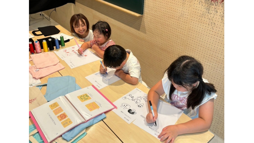 特に好評なのが、百貨店やイベントスペースで行う「デザイン体験」です。子どもが描いた絵を、バッグやTシャツなどの実際に使える形にして届けます。