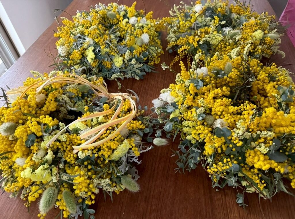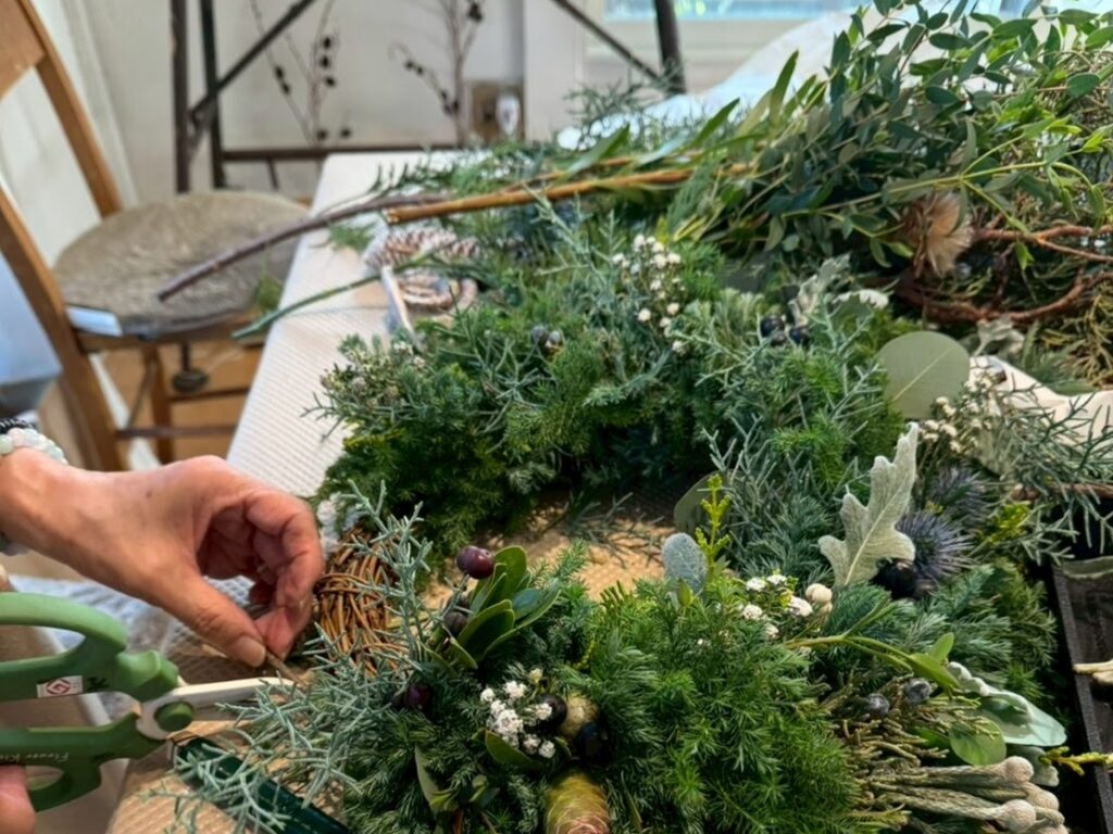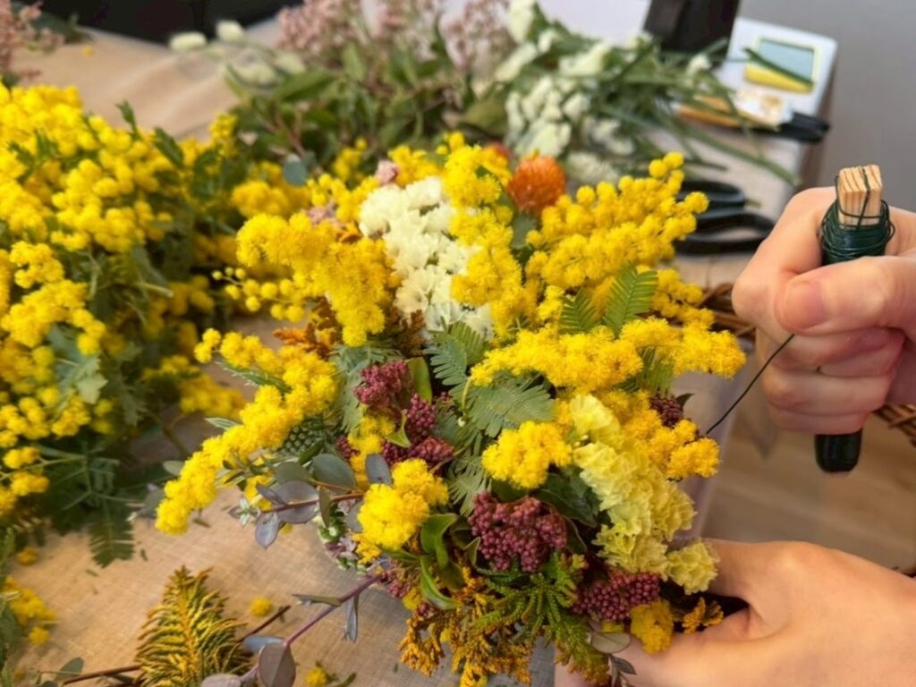 現在、ミモザ、紫陽花、スモークツリーなど季節感を存分に味わうことができるワークショップを開催する容子さん。ワークショップの参加者はまず、その花材の多さに驚きます。