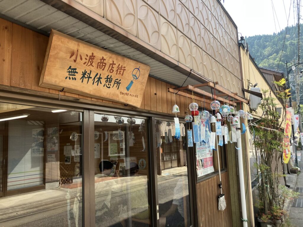 「やぶさんのフルーツかき氷」はこちらの無料休憩所で食べることも。休憩所内には近隣店舗の食事メニューも紹介されています。