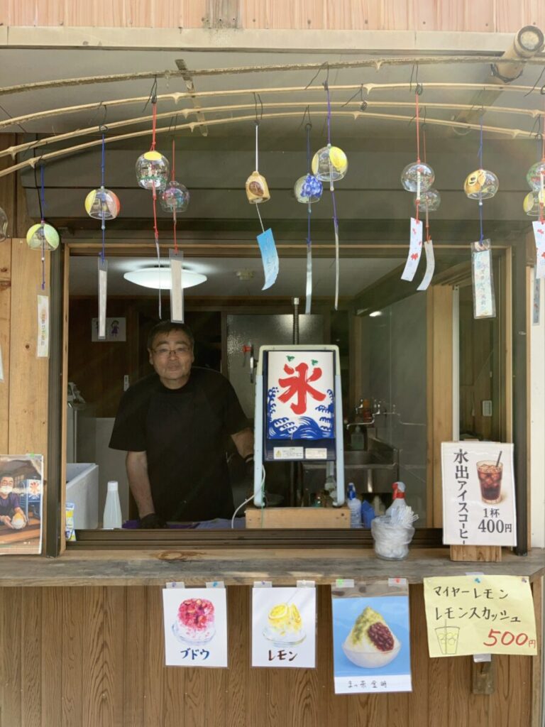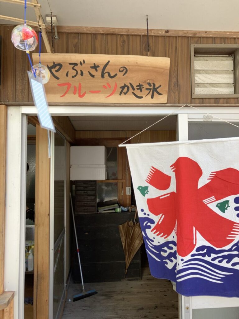 「あそこのかき氷おいしいよ!」とおすすめしてもらった「やぶさんのフルーツかき氷」。ふわふわのかき氷には、果肉の乗った自家製ソースがたっぷり。火照った身体に心地よく染み込んでいきます。
