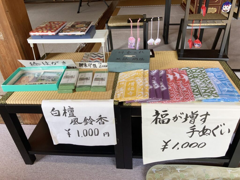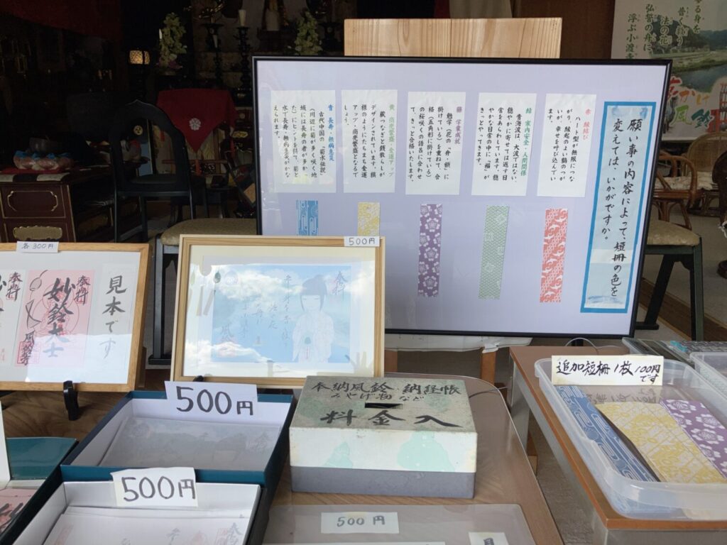 そのほか、御朱印帳や絵葉書、手ぬぐいなどのお土産も。自由に利用できる一文字写経も用意されていました。