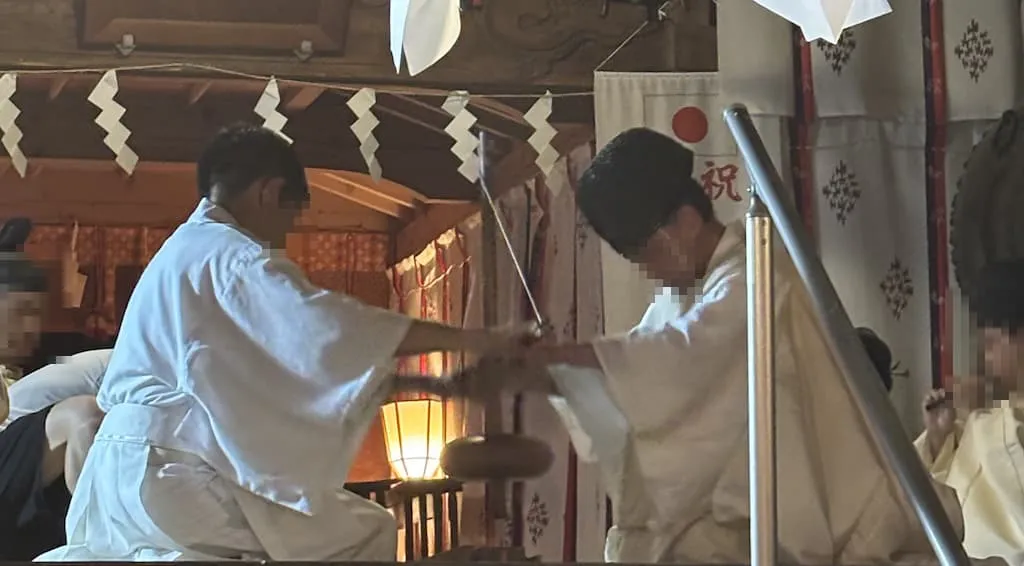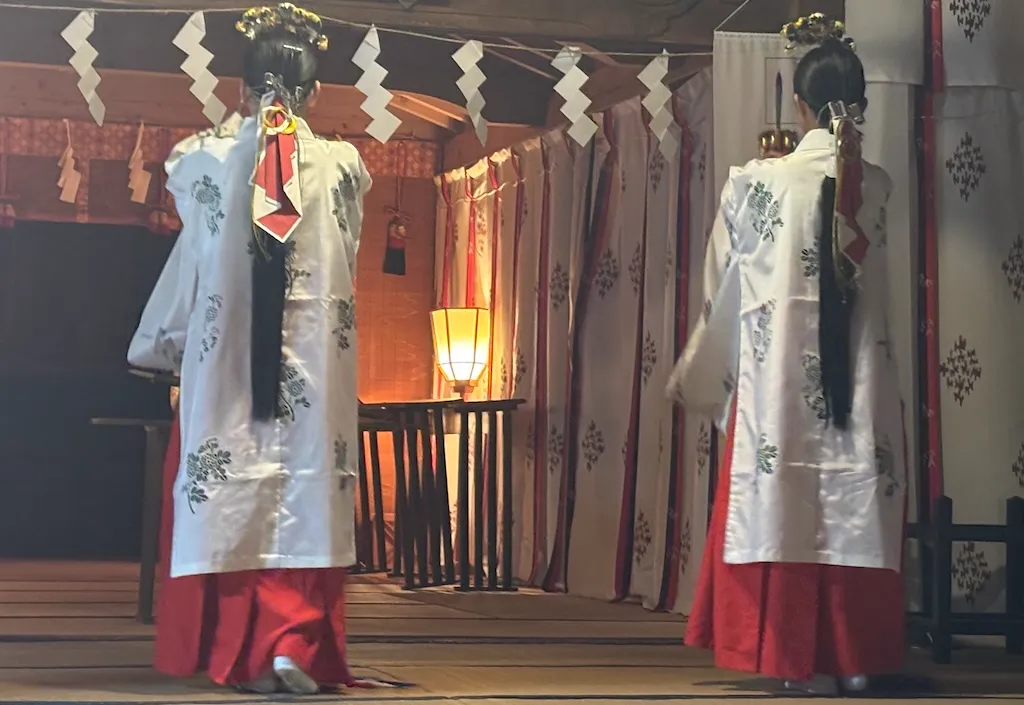 松明の温かな明かりに包まれながら祝詞や雅楽の美しい調べが響く中で、自然と荘厳な世界に引き込まれていきます。