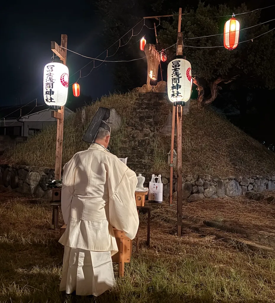 石段を上って富士塚へ向かう明かりを、人々がそっと見送ります。静かに響く雅楽のもと神事は進み、宮司さんが火を富士塚の裏手に運んでいきました。