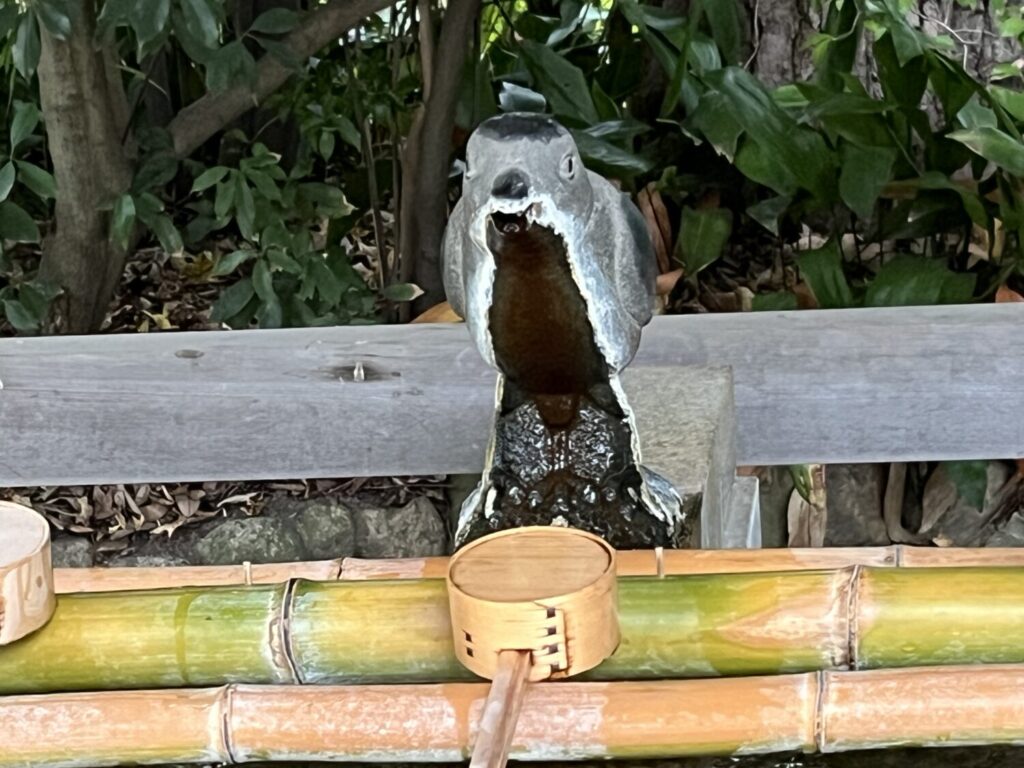 こちらは手水舎です。からすの口から水が出てきます。よく見ると足の数は3本。やたがらすですね。