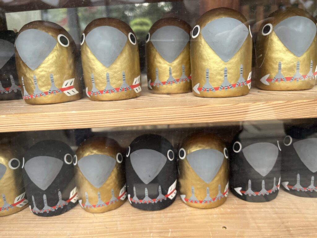 弓弦羽神社でやたらと目にするのがシンボルやたがらすです。やたがらすは神武天皇の東征の際に道案内をしたとされる、日本神話に登場する三本足のからすのことです。そのことから、勝利に導いてくれるシンボルと言われて、サッカー日本代表のエンブレムにも描かれるようになったそう。