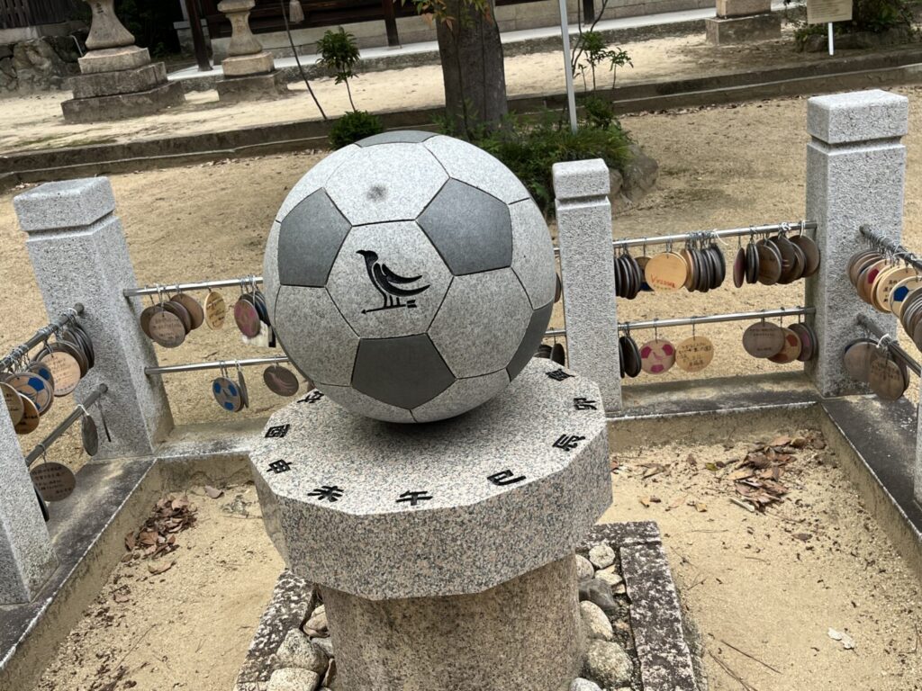 それもそのはず、実は御影はサッカーともゆかりがあり、日本サッカー発祥の地ともいわれています。現在の神戸大学教育学部の源流となる御影師範学校で、日本初のサッカーチームができたことを皮切りに、高校選手権大会で兵庫県代表は数多くの優勝を手にしてきました。境内にはサッカーボールの御影石が祀られていました。そのサッカーボールにもやたがらすが描かれています。そんなところから、サッカー関係者やファンが必勝祈願に訪れることも多いようですよ。
