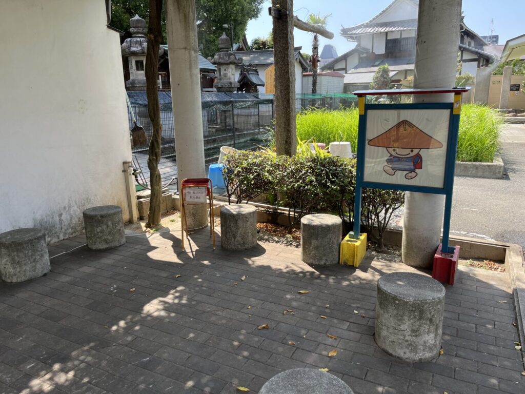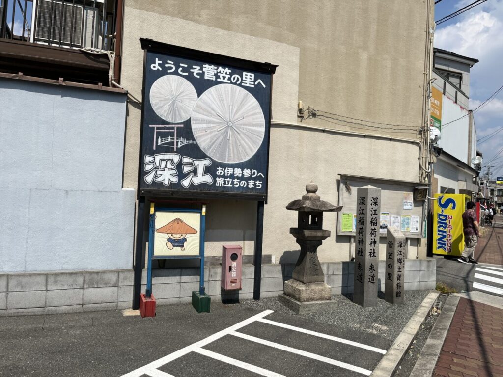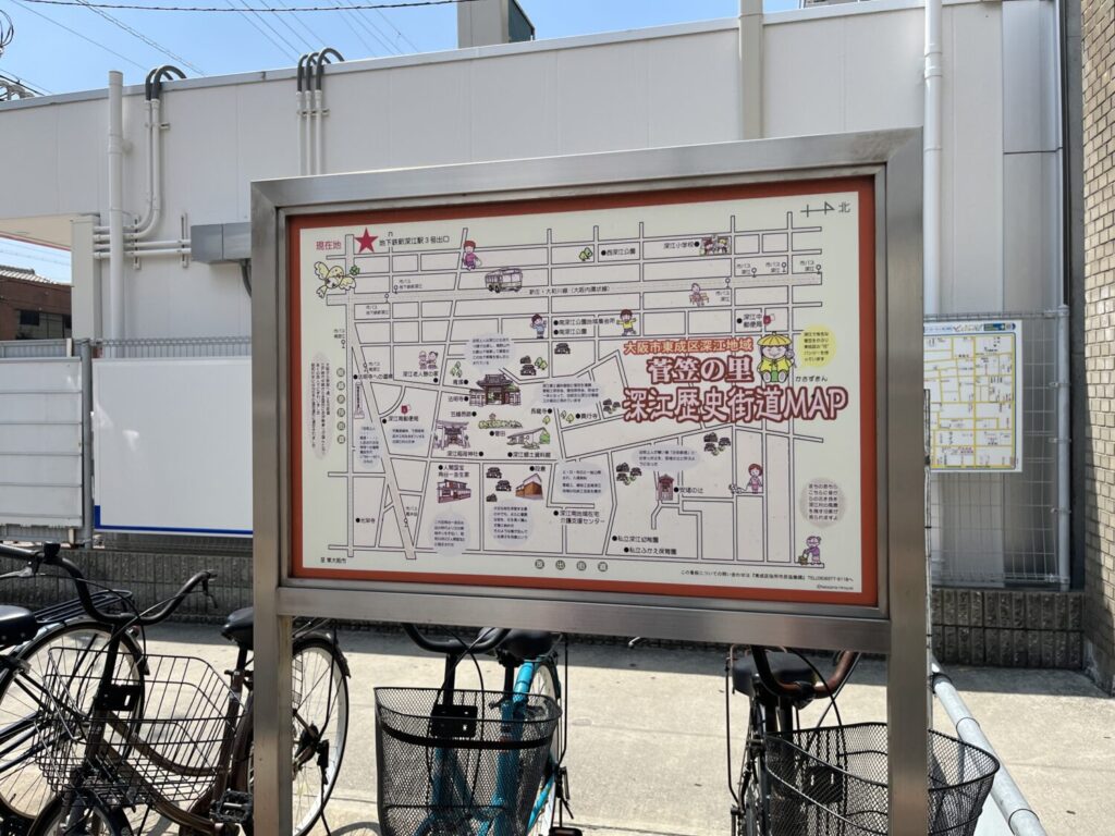 新深江神社は大阪メトロ千日前線の新深江駅を降りてすぐのところにあります。駅を降りたらすぐ看板がありました。そこには「菅笠の里 深江歴史街道MAP」の文字が……。