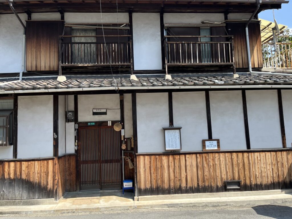 鳥居に行くまでの間に、人間国宝の角谷一圭氏の生家があります。角谷一圭氏は茶の湯釜などの鋳金で有名な方ですが、さすが菅笠の里だけあって、こちらの入り口に菅笠が飾られているのが粋ですね。