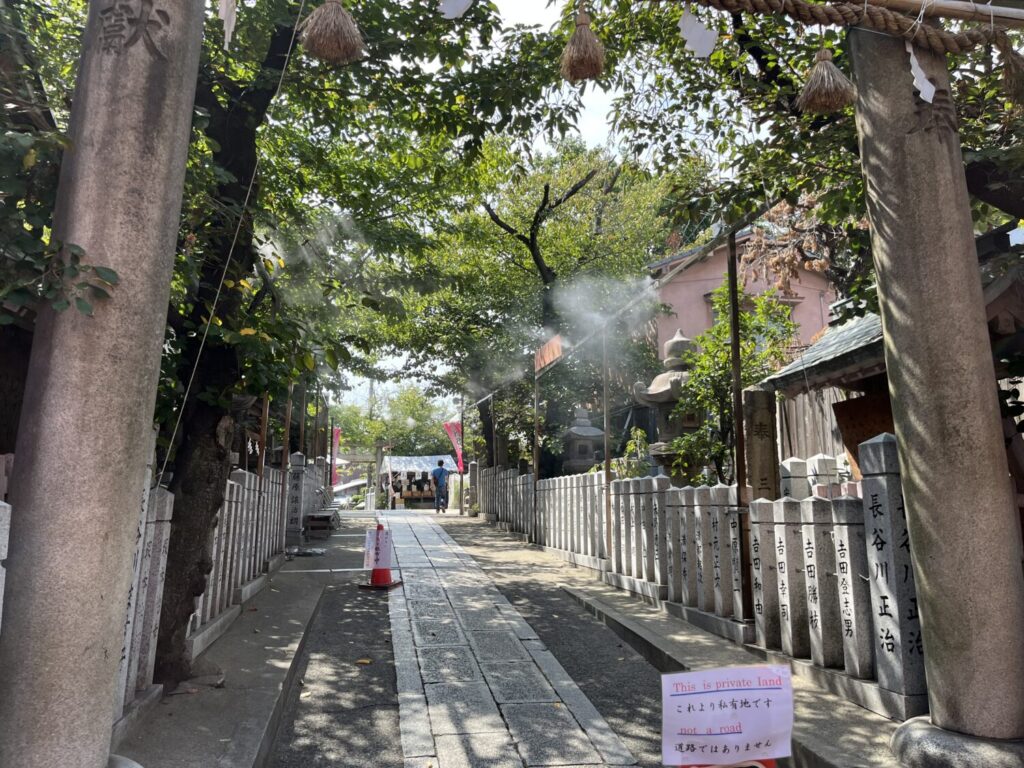彌榮神社は鶴橋の賑わいから少し外れた住宅街にあります。神社を住宅と見間違えるほど、住宅に密着していて、距離もこんなに近いんです。