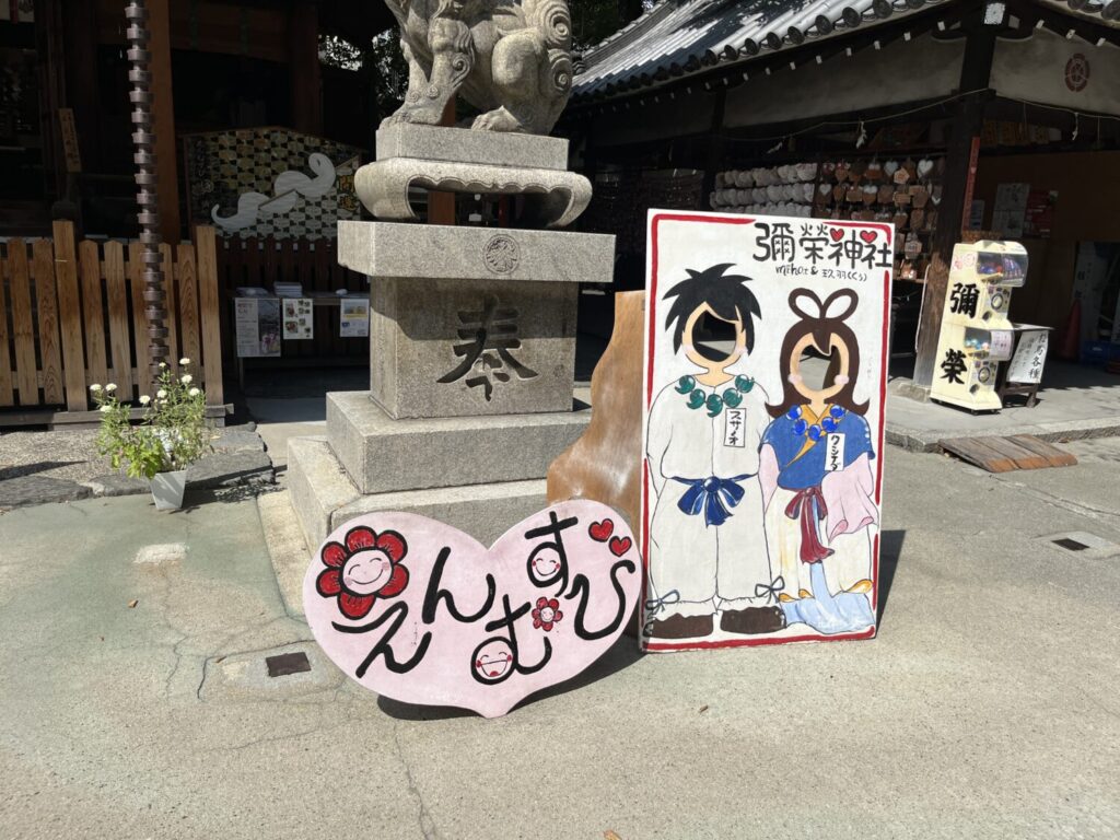 それはこちらからもわかります。これは縁結びの顔出しパネルです。カップルでこの地を訪れて顔出しして写真を撮っていくのでしょうか?これだけでも十分甘い雰囲気が漂っていますよね。