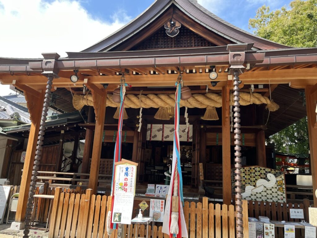 彌榮神社は祇園信仰の神社なのですが、特に厄除けや縁結びで有名です。とはいえ、同じ祇園信仰でも八坂神社とは違って強い厄除けのイメージではなく、もっとソフトな厄除けのイメージで、女性らしい愛情と包容力で、良縁成就を叶えるパワースポットでもあります。櫛名田比売(素戔嗚尊の妻)が祀られていることにも関係するのかもしれませんね。