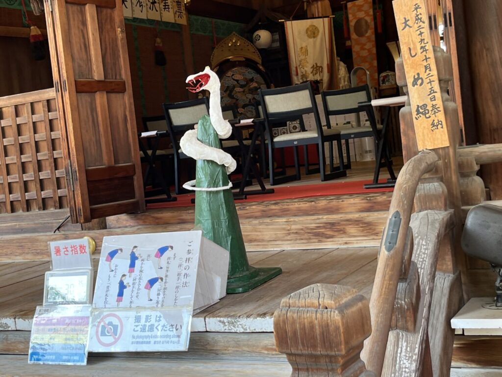 なんと白蛇が巻き付いているんです。実は、白蛇は古くから縁結びの象徴。そういったところから、シンボルに白蛇が選ばれたのかもしれません。また、それだけでなく、鶴橋周辺では昔から「白い蛇を見たら良いことがある」「神社の近くで白蛇を見たら縁起が良い」といういわれが残っているそうです。そんな日常の小さな奇跡のような素朴な信仰が、この白蛇信仰に息づいているのかもしれませんね。それにしても、この白蛇、とても愛嬌のある蛇ですね。