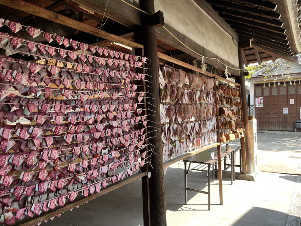 女性らしさといえば、こちらもそう。ハート型の絵馬です。たくさんの女性たちの思いがあふれていますね。ハートの恋みくじや招き猫みくじなど、女性好みのおみくじもありましたよ。