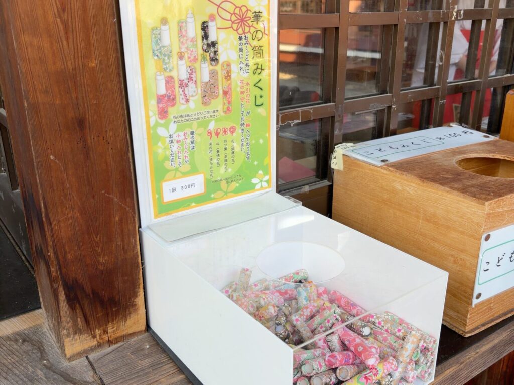 おみくじには花の筒みくじがありました。この花の筒みくじ、和柄の筒の中におみくじがあるのはもちろんですが、水引で作った花も入っているそうです。それぞれの花に願いが込められていて、お守りとして持ち歩けるそうですよ。