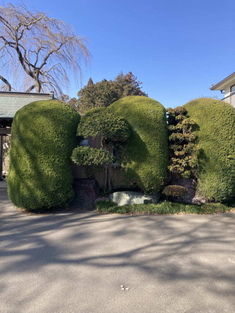 駐車場から山門へ行く途中にも、大きな緑の木が立ち並んでいました。青い空に映えて、とても心落ち着く綺麗な風景でした。