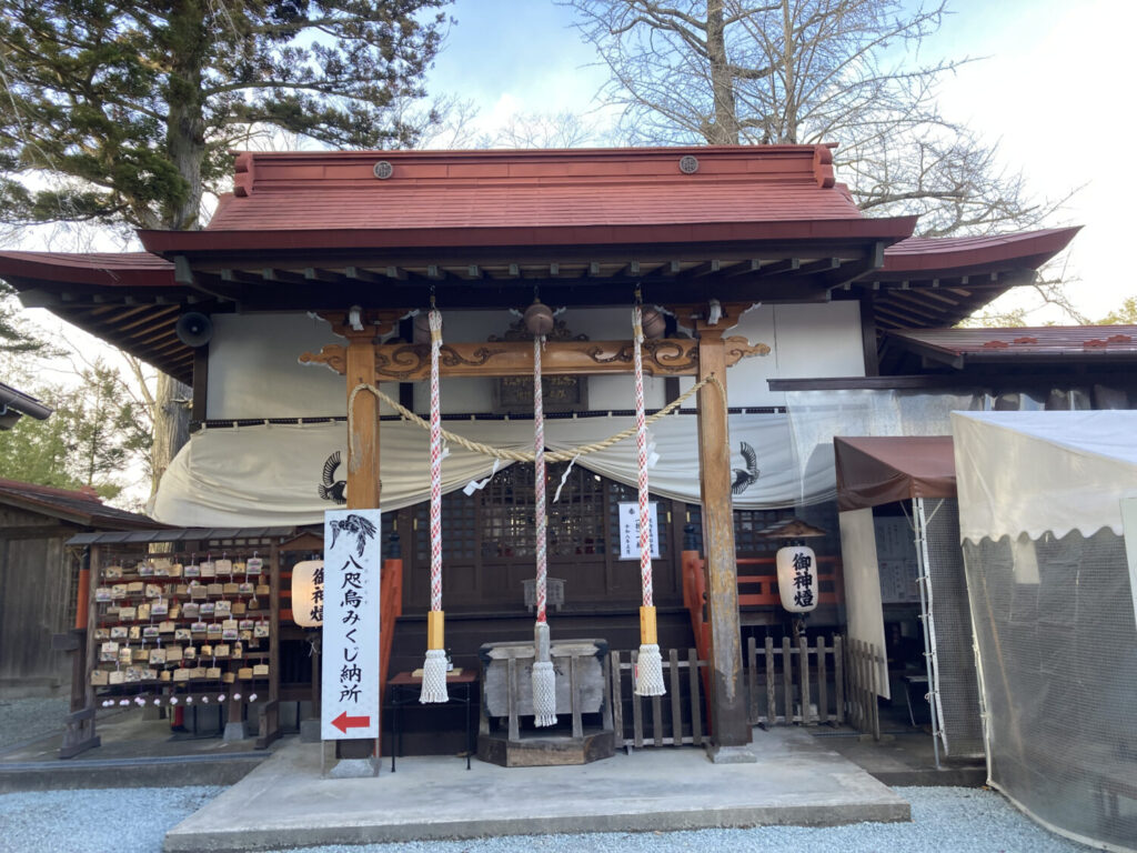 社務所はおみくじ売り場のすぐ近くにありました。祈祷の受付もここでしています。後で紹介する八咫烏(やたがらす)みくじもここで買えるので、ぜひ覗いてみてください。