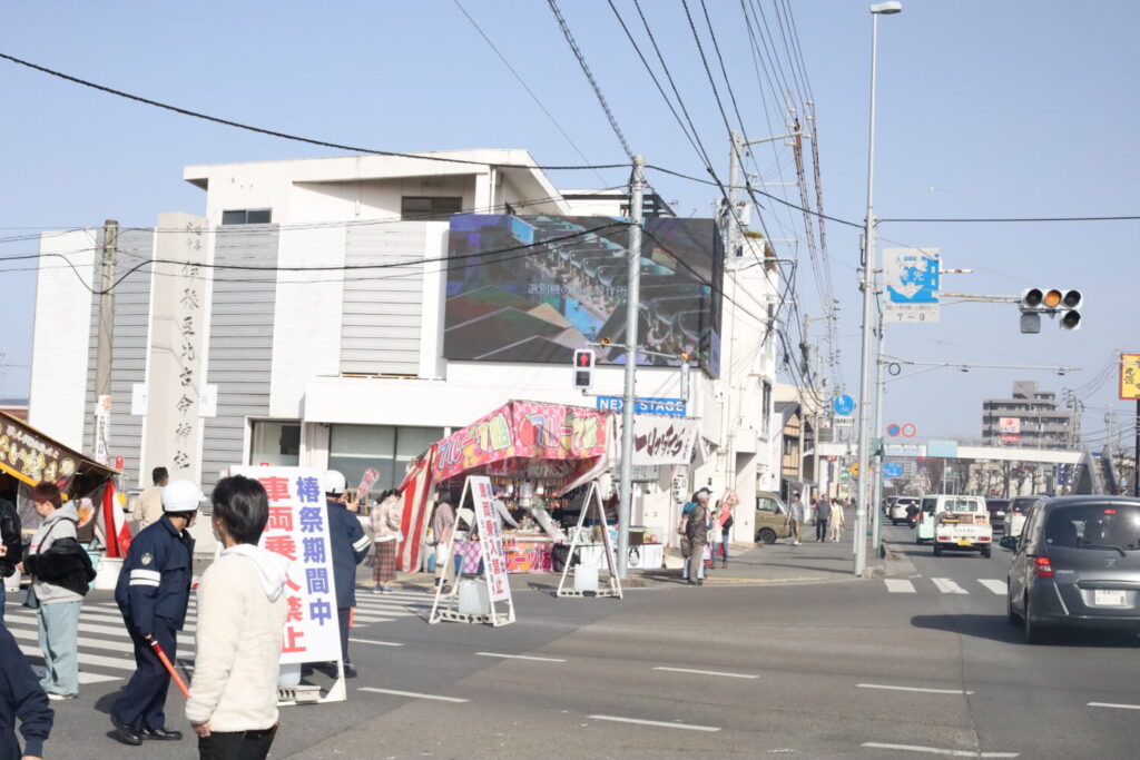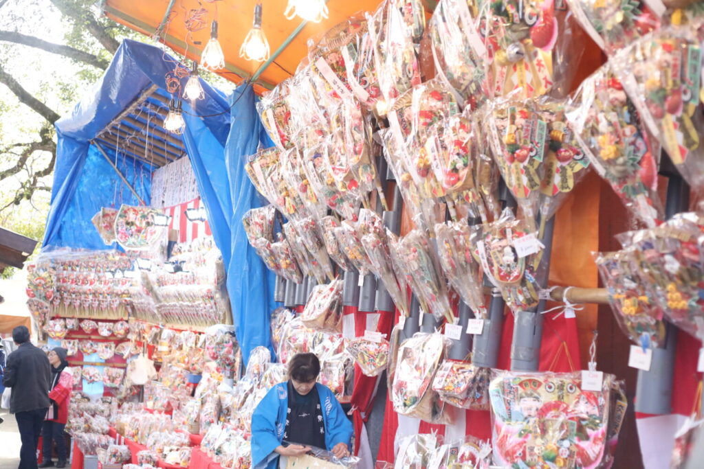 椿まつりの見どころのひとつは、なんといっても露店の数と種類の豊富さです。屋台には食べ物だけでなく、祭りでしか手に入らない縁起物や熊手などが販売され、お土産として持ち帰る人も多く見られました。